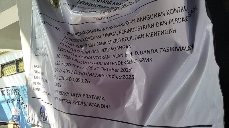 Berdasarkan informasi yang tercantum pada papan proyek, kegiatan tersebut merupakan Pemeliharaan Gedung dan Bangunan Konstruksi Fisik milik Dinas Koperasi dan UMKM. Nilai kontraknya tercatat Rp 170.400.050,26, dengan masa pelaksanaan singkat hanya 30 hari kalender, dimulai sejak 23 September hingga 21 Oktober 2025.