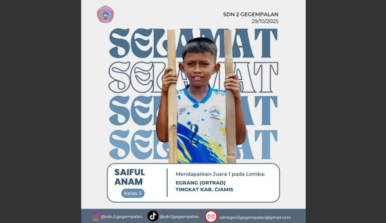 Selamat kepada Saiful Anam, sang juara egrang dari SDN 2 Gegempalan, yang telah mengharumkan nama sekolah dan daerahnya.