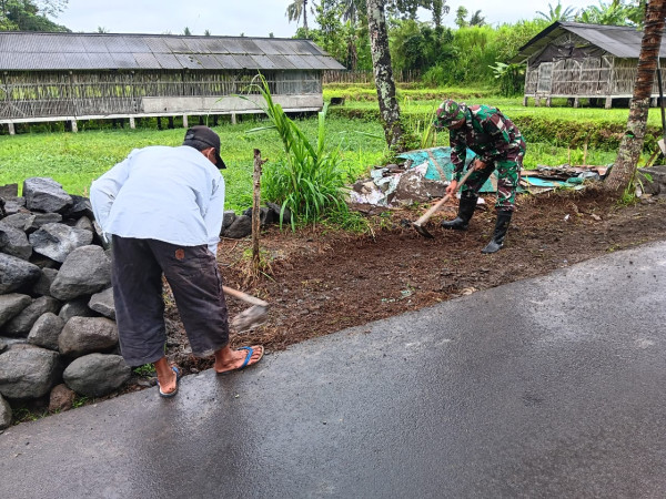 Sejak pagi, aktivitas pembersihan sudah terlihat di berbagai titik jalan desa. Dengan alat sederhana seperti cangkul, sabit, dan karung, Sertu Agus Hadian bersama warga membersihkan rumput liar, semak belukar, serta menyingkirkan tumpukan sampah yang mengganggu pandangan dan kenyamanan pengguna jalan.