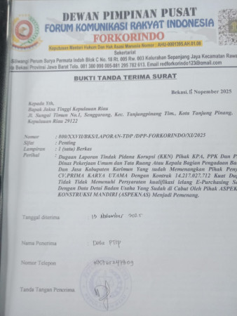 SALIRA TV | KAB. KARIMUN — Pada Senin, 08/12/2025, Ketua DPP LSM Forum Komunikasi Rakyat Indonesia (Forkorindo), Tohom TPS, SE., SH., MM., resmi menyampaikan laporan bernomor 800/XXVII/BKS/LAPORAN-TDP/DPP-FORKORINDO/XI/2025 kepada Kejaksaan Tinggi Kepulauan Riau. Laporan tersebut memuat dugaan tindak pidana korupsi terkait penyaluran dana hibah untuk pembangunan sejumlah gedung di lingkungan Polres Karimun serta Kejaksaan Negeri Karimun.