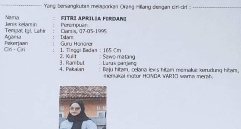 Berdasarkan keterangan keluarga, Fitri terakhir kali terlihat meninggalkan rumah sekitar pukul 13.30 WIB pada 1 Januari 2026. Sejak saat itu, seluruh upaya komunikasi terputus. Fitri diketahui berangkat dari kediamannya yang berlokasi di Dusun Cigoong, Desa Sirnabaya, Kecamatan Rajadesa, Kabupaten Ciamis.