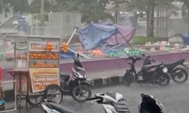 Dampak paling nyata terlihat pada fasilitas milik para pedagang kuliner. Beberapa tenda berwarna cerah yang biasa digunakan untuk berjualan tampak terbalik dan terseret angin. Para pedagang berusaha keras menyelamatkan peralatan serta barang dagangan mereka meski harus berjibaku di tengah hujan deras.