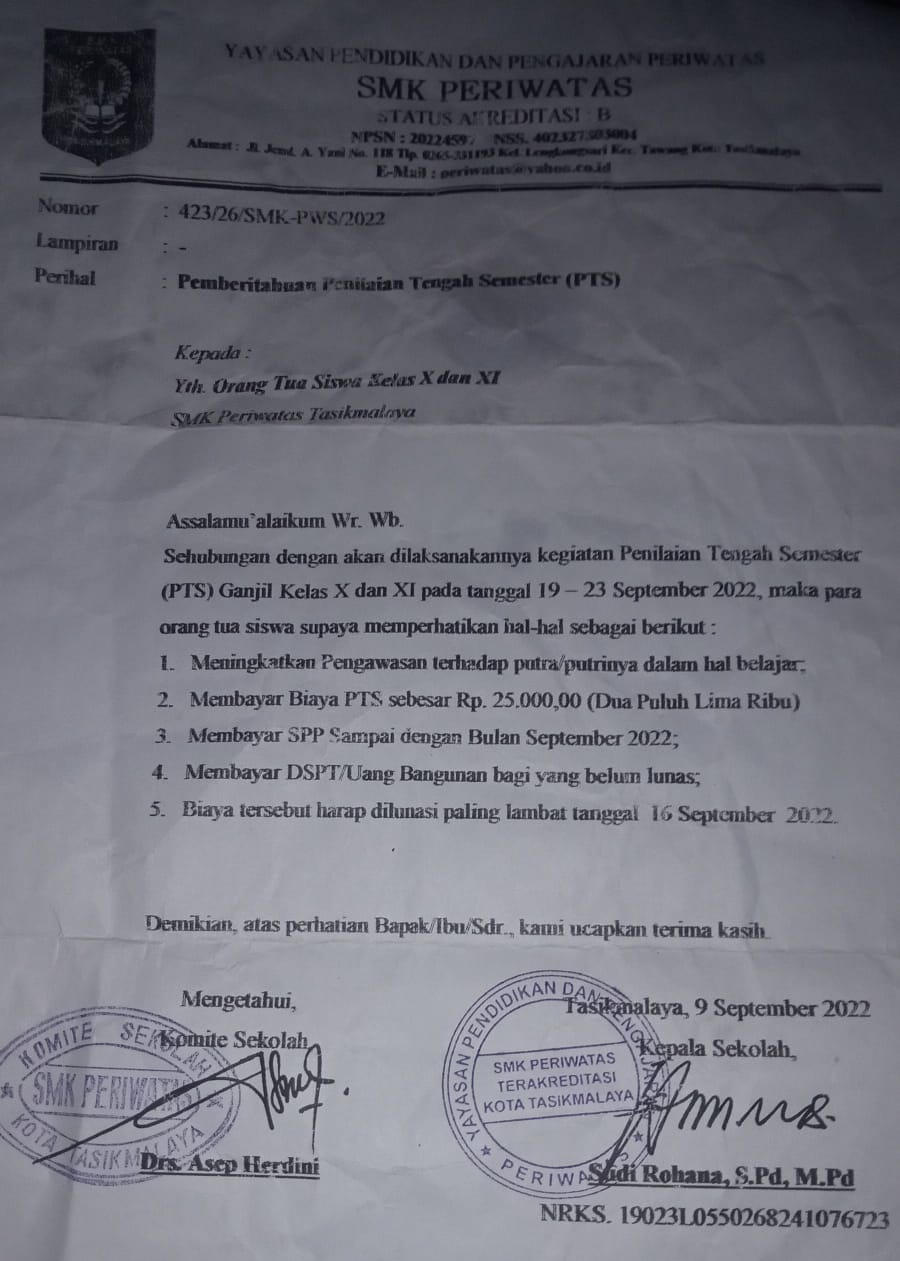 SALIRA TV | KOTA TASIKMALAYA, JAWA BARAT — Sejumlah siswa di SMK Periwatas, Kota Tasikmalaya, mengeluhkan tidak dapat mengikuti Penilaian Tengah Semester atau PTS lantaran belum melunasi iuran sekolah.